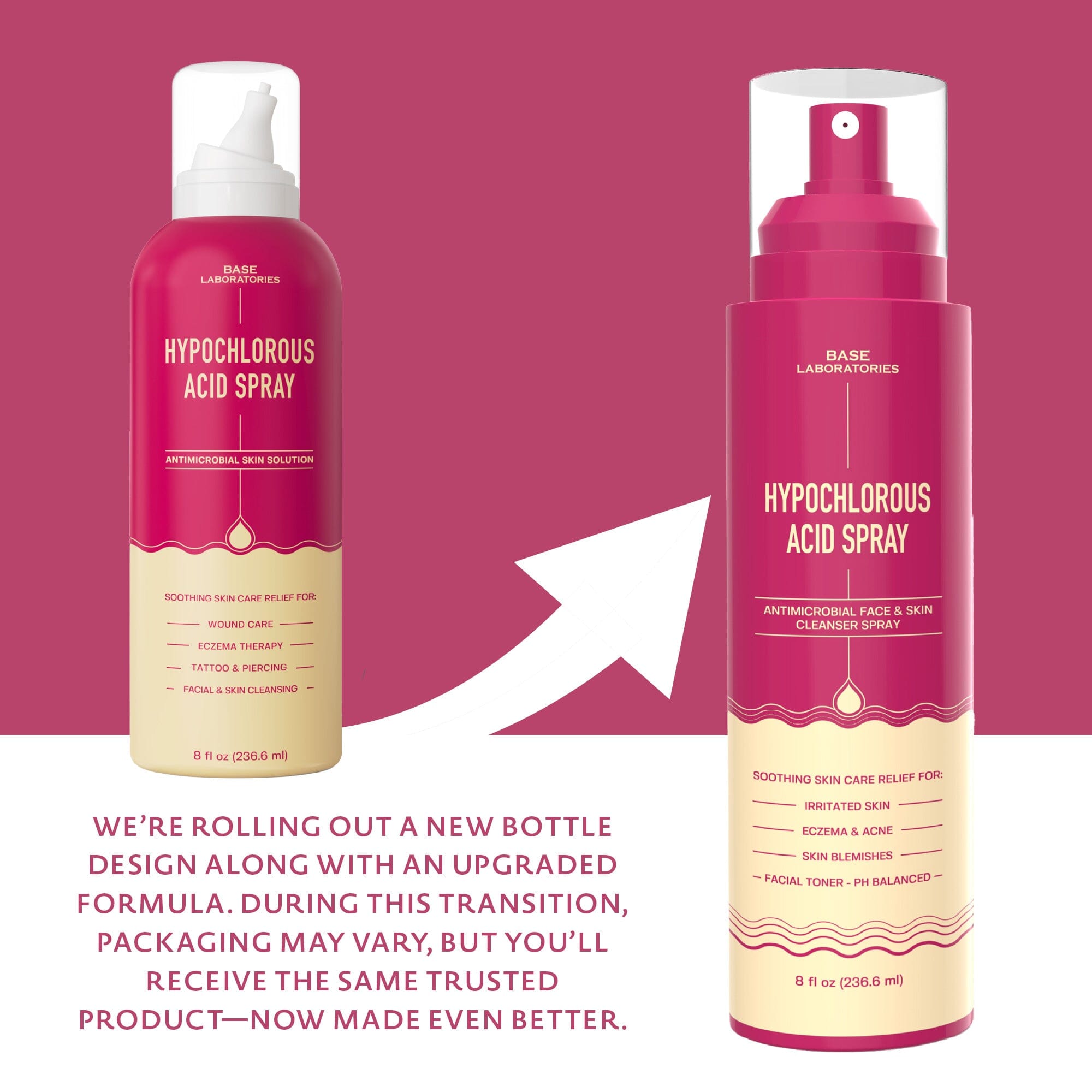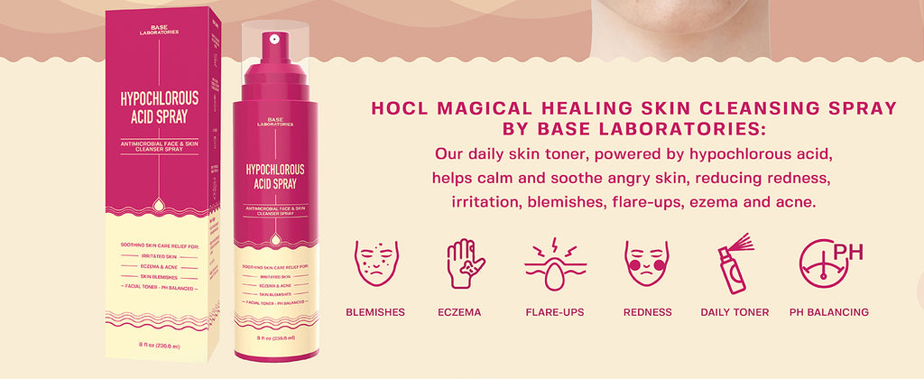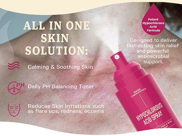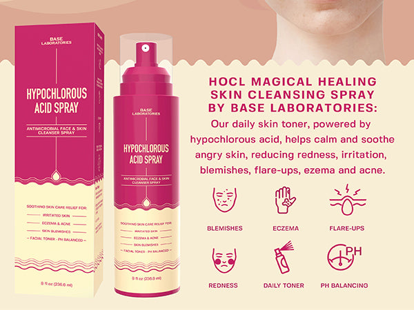 Introducing Base Laboratories Hypochlorous Acid Topical Skin Cleansing Toner Spray - Contains active natural ingredients, including pure Hypochlorous Acid and Saline Solution also known as Sea salt. Our Skin Cleansing and Recovery Spray can be used topically to improve appearance of the skin while soothing and cleansing. Ideal target spray as an all purpose skin toner, piercing aftercare & tattoo aftercare.