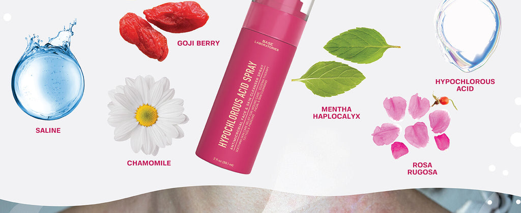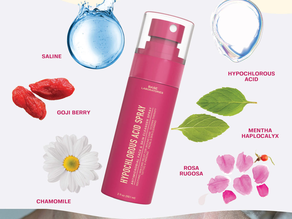 Introducing Base Laboratories Hypochlorous Acid Topical Skin Cleansing Toner Spray - Contains active natural ingredients, including pure Hypochlorous Acid and Saline Solution also known as Sea salt. Our Skin Cleansing and Recovery Spray can be used topically to improve appearance of the skin while soothing and cleansing. Ideal target spray as an all purpose skin toner, piercing aftercare & tattoo aftercare.