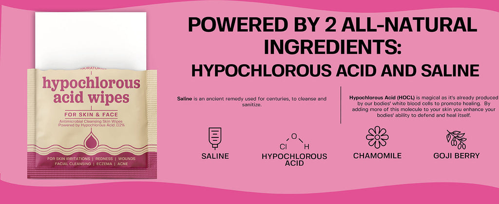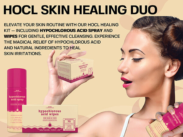 Elevate your skin routine with our HOCL Skin Healing Kit - This bundle, including Hypochlorous Acid Spray and Hypochlorous Acid Wipes, provides a gentle and effective cleansing experience for your skin and helps heal your skin from irritations all this due to the main ingredient - hypochlorous acid spray and other natural ingredients.
