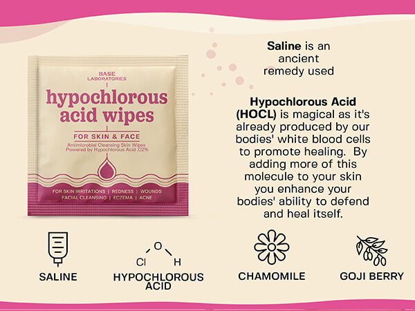 Base Labs Hypochlorous Acid Spray and HOCL & Saline Solution Wipes have transformed my skincare routine. The spray's healing prowess is unmatched, and the wipes are my go-to for piercings and wounds. The addition of chamomile and goji berry enhances their effectiveness.