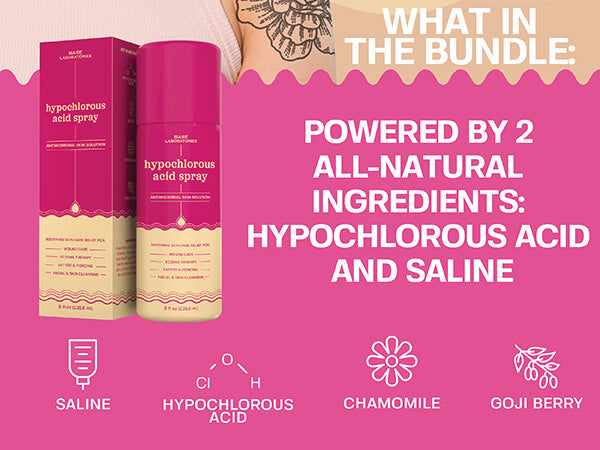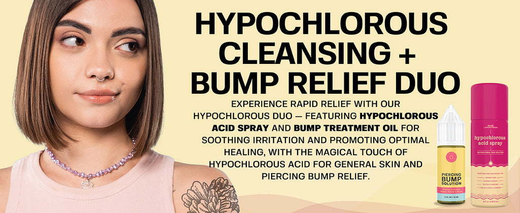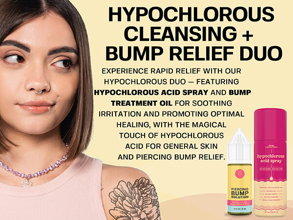 Experience rapid relief with our Hypochlorous Cleansing + Bump Relief Duo. This dynamic pair, featuring Hypochlorous Acid Spray and Piercing Bump Treatment Oil, works synergistically to soothe irritation and promote optimal healing - due to the antibacterial ingredient - hypochlorous acid spray - for your general skin irritations and specifically for piercing bump relief.