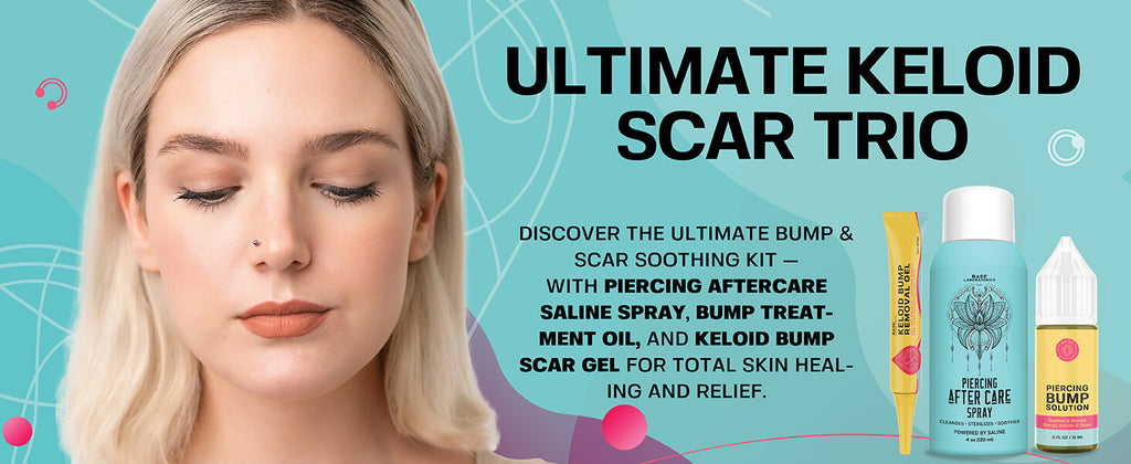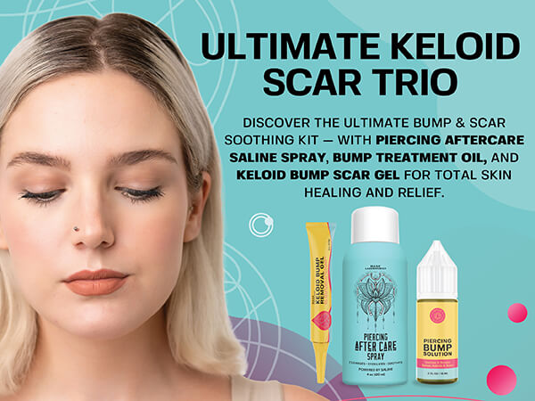 Experience the Ultimate Keloid Scar Trio - a Piercing Bump & Scar Soothing relief kit - This bundle includes Piercing Aftercare Saline Spray, Piercing Bump Treatment Oil, and Keloid Bump Scar Gel for total skin healing and keloid bump relief