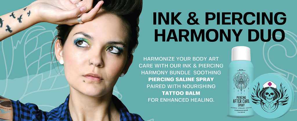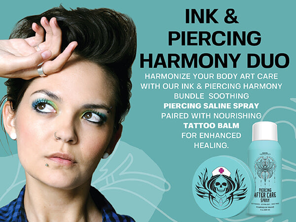 Find the perfect balance for your body art with our Ink & Piercing Harmony bundle. This set combines the soothing Piercing Aftercare Saline Spray with the nourishing properties of our Tattoo Aftercare Balm. Experience Skin healing after your next piercing and Tattoo